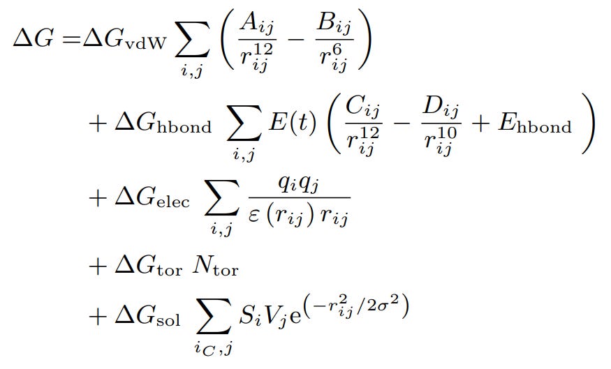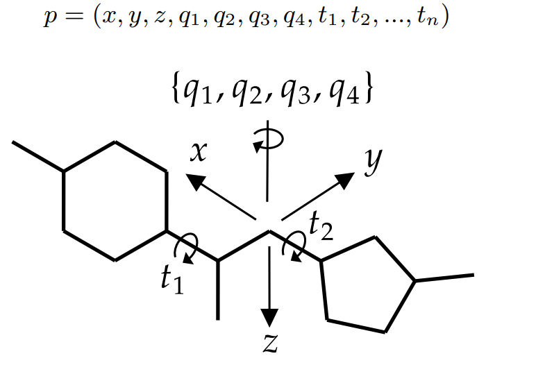 Molecular Docking은 리간드와 타겟 단백질 사이의 결합 친화도를 도출하기 위하여 scoring function S(p,t)를 사용하는데, 여기서 p는 ligand pose이고, t는 타겟 단백질의 입체구조이다. 참고로 p는 아래 그림과 같은 구성성분을 가진다.