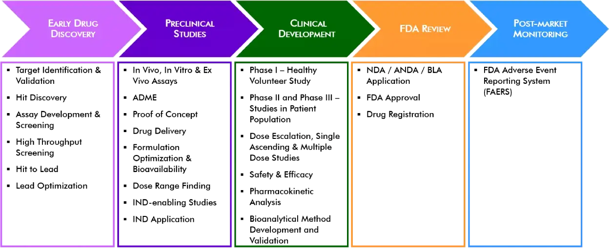 현재 약값이 비싼 이유에는 약이 만들어지기까지의 과정의 비용이 큰 영향을 미친다. 하나의 약이 만들어지기까지는 다음과 같은 과정을 거친다.