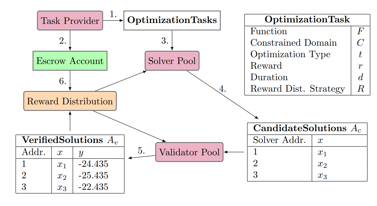 Validator들은 Ac의 이 정답들이 최적화 문제의 조건에 부합하는지 먼저 확인하고, 각각의 x에 대한 결과값 y = F(x)를 도출한다. Validator들끼리 합의에 이뤄진 (x,y) 쌍들은 검증된 정답 집합 Av로 발행된다.